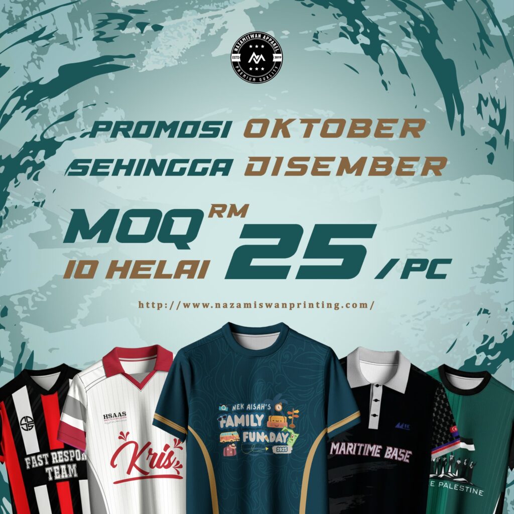 Dengan menggunakan teknologi pencetakan sublimasi yang terkini dan bahan berkualiti tinggi, Nazamiswan Printing menghasilkan cetakan yang cerah dan tahan lama untuk memastikan pelanggan kami terpukau dengan kualiti kami. Anda boleh memilih sama ada ingin mempromosikan perniagaan anda, membuat hadiah yang dipersonalisasi, atau merekabentuk pakaian anda sendiri, Nazamiswan Printing sedia membantu mewujudkan visi anda.